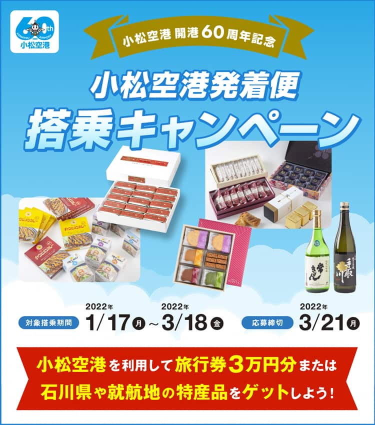 ![]() 小松空港開港60周年記念搭乗キャンペーン ご予約 旅の計画 航空券予約 空席照会 Ana | ![]() 小松空港anaラウンジ ハイヒールで世界を歩く | ![]() 新幹線と競合 小松空港の存在意義と 空路を選ぶメリット |